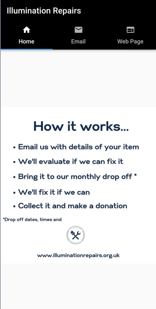 The biggest flaw with this app is that for all of the people who approach us for a repair it is a one-off contact – who would download an app just to get one or two things repaired, so it will never go into production in it’s current form. All is not lost – I know a little more about how to embed a video into a Flutter app, I have more of an idea about how to create an email enquiry form in Flutter, I can put links into buttons to webpages and email (the second email code works a bit different to the first) and the links to the webpages including Facebook/Meta can be done several ways – I tried the most common way (according to Stack Overflow) and it didn’t work as it was trying to parse ipv6 addresses and I think that that particular method was best suited to ipv4 addresses and so I found another method much better. I will use what I have learned in other apps and it has opened my horizons to the possibility of other apps.