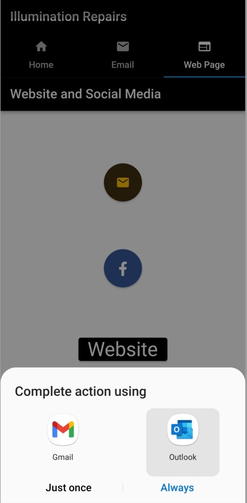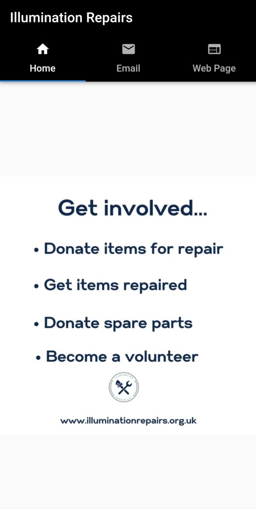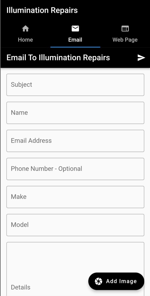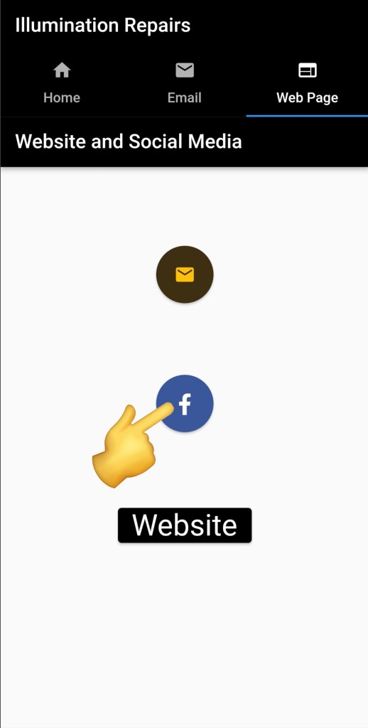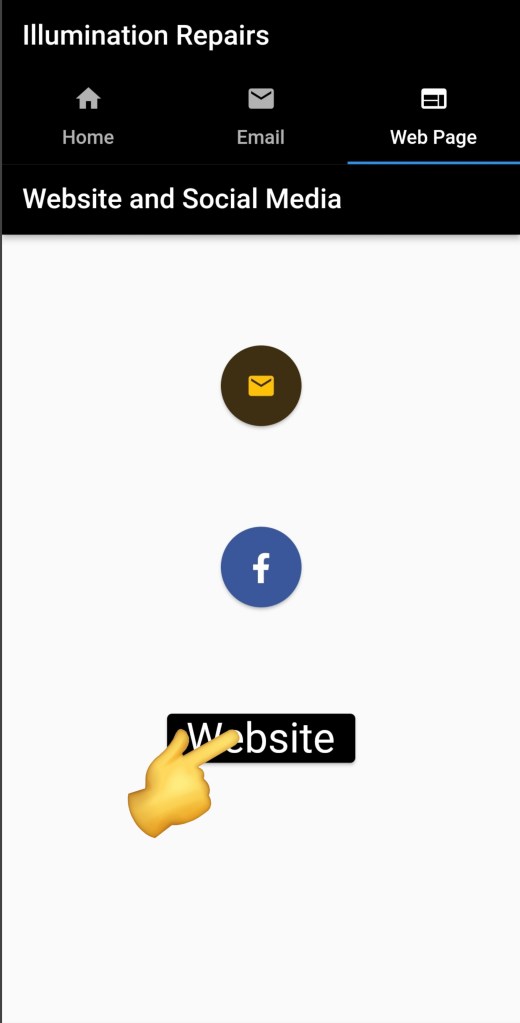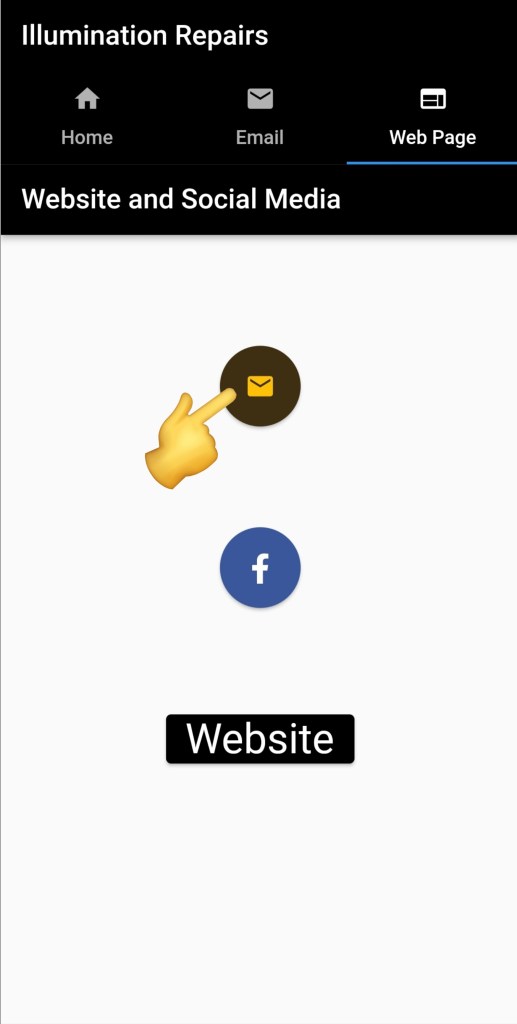 I first of all I discovered how to create three tabs within the AppBar which would enable me to switch between three pages easily. They were “Home”, “Email” and “Website”. I used the artwork from the Illumination Repairs Instagram posts – cheeky I know but I was hoping that the company would benefit from my efforts so it was justified. The colour scheme that they had chosen was black and white so I felt that I had to keep it as it is part of their “brand” – I would have much rather used a more colourful palate.