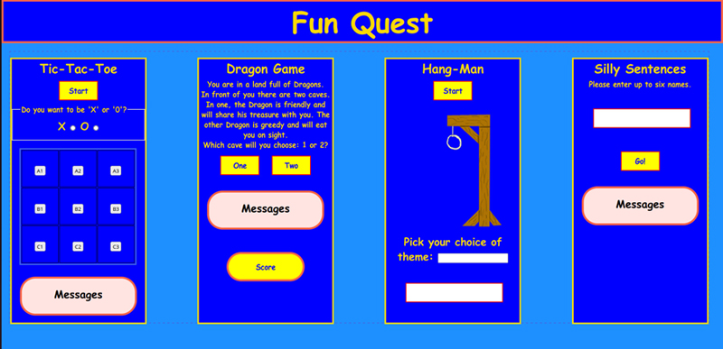 This is the start. I am just mapping out how I want it to look at the moment and even that will need a lot of styling. I have started to add some interactivity to it – all of the buttons are clickable although, they don’t do anything but give a speech bubble which I will change for something more useful. The page also adapts depending on whether it is being viewed on a traditional pc or laptop, a tablet or a smaller device such as a mobile phone. The mobile phone view shows the four games as a scroll in a vertical order, one after another.