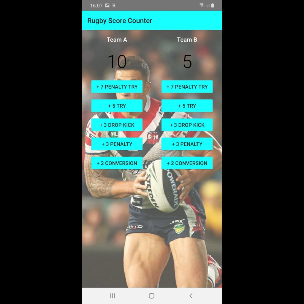 I decided to base my next project on a score app for Rugby Union football using the Court app for guidance. The app has two sets of score buttons, one for Team A and one for Team B. Each set of buttons consists of: