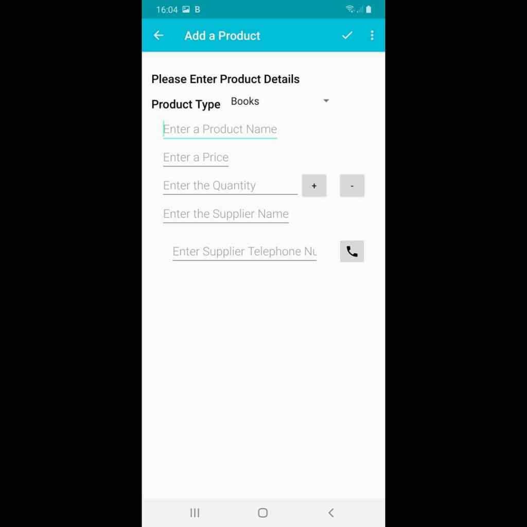 On the “Add a Product” page you can add relevant data about your product. On this page you can enter the product name, price, quantity with the additional function of making small adjustments with “+” and “-” buttons, the supplier name and the supplier telephone number which links via an intent to the telephoning intent. The app is based on the idea of a book, stationery and toy shop so there is a drop down list to select whether the product is a Book, a toy or a stationery item.