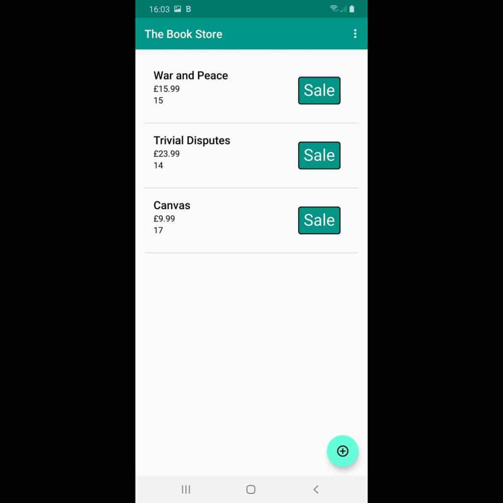 The type in bold shows the product name, below that is the price and below that is the number in stock. A sale is recorded by pressing the “Sale” button on the relevant item which reduces the stock number by one. If you click on the product instead, you can edit the details of the product in the case of inaccurate description, price or stock level. The “kebab” menu also allows a menu option to clear the whole database of entries. It was decided that we should only create a simple user interface because the emphasis was to create a usable database but I am sure that this app could be “prettied” and expanded to make it into of commercial value without much change to how it operates.